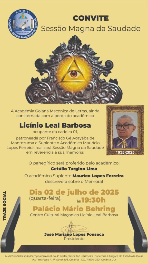 A Academia Goiana Maçonica de Letras, ainda consternada com a perda do acadêmico Licínio Leal Barbosa, ocupante da cadeira 01, patroneada por Francisco Gê Acayaba de Montezuma e Suplente o Acadêmico Maurício Lopes Ferreira, realizará Sessão Magma da Saudade em reverência à sua memória.